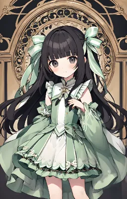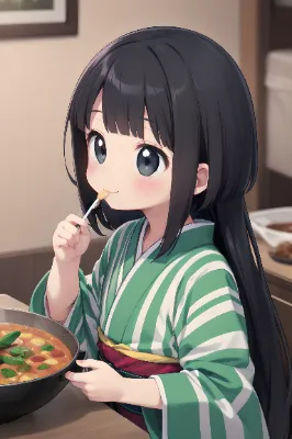 12 years old, young girl, very long hair, black hair, straight hair with a mint green stripe, black eyes, flat chest, straight across bangs, princess cut, very long sideburns, round head with drooping eyes, cute and meek expression, bob cut with long back hair, wearing a kimono, smiling, curry, eating