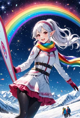 8K,((cinematic light,masterpiece,best quality,Ultra extremely detailed,perfect anatomy,detailed,high-resolution,highres,extremely detailed,sharp focus:1.5)),strange pose,((high-contrast:1.6,strong back-light,close-up , from_back:1.5,back,flower print , child elf wearing glossy decoration glitter light pink ski-wear with brilliant sequins and flills,light rainbow head-band,short skirt,rainbow knit scarf,gloves:1.5,tights)),looking at viewer:1.5, (extra detailed red Eyes with reflection), glitter waving shining side-ponytail:1.5, (white hair with curly),elf ear with big earrings,big smile,wide open mouth,blush,lipstick,full fresh lips,wet-lip,big hip,big small breasts,soft wind,armpit,ponytail,hand skiboard,BREAK,snowy mountains,galaxy,night sky,shooting stars, round many stars,birds,glitter city in the distance,dark cloud, big white roses,<lora:hohoaka:1> <lora:make25d_type1_v100:1>,,,,