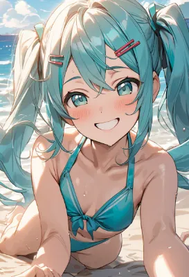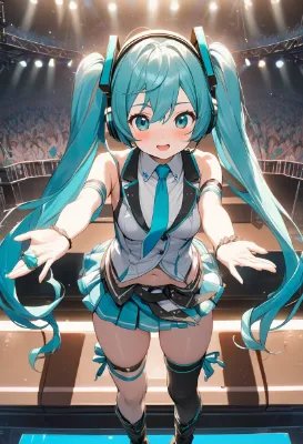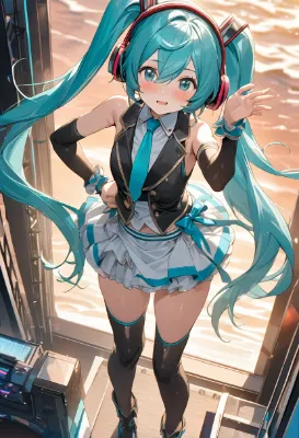 masterpiece, best quality, extremely detailed, anime, girl, Hatsune Miku, VOCALOID, long twintails in teal color, miniskirt, necktie, headphones, sleeveless, black long boots, black arm covers, above the sea, live stage, idol, live, summer