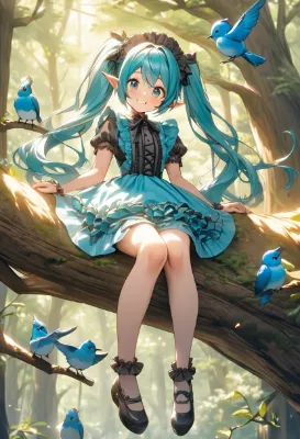 masterpiece, best quality, extremely detailed, anime, girl, Hatsune Miku, VOCALOID, long twintails in blue-green color, skirt, girl in yellow frilly gothic lolita dress, elf, beautiful girl, cute, smiling, sitting on a thick tree branch in a sun-dappled forest, bird playing around in yellow, pansies blooming in yellow, fantastical, mysterious, fantasy