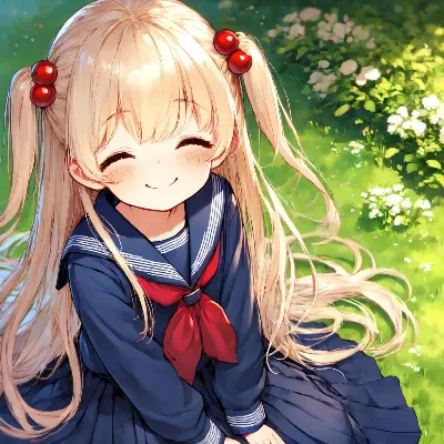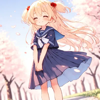 1girl, (little female child:1.2), two side up, blonde hair, very long hair, navy blue sailor long dress, navy blue serafuku, navy blue sailor collar, pleated long dress, skinny, thin legs, slender, red bobbles, smile, happy, from side, looking away, wind, petals, spring, cherry blossoms, outdoors, spring, masterpiece, best quality