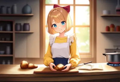 1girl,solo,young,mermaid,blond hair,short bob hair,(hair bow:1.4),red bow,blue eyes,round eyes,cheerful expression,small breasts,iridescent fish tail,blue and green scales,hopping on beach,mid-jump pose,arms outstretched for balance,tail bending upward,sandy beach,(ocean waves:1.2),seashells scattered around,palm trees,sunset sky,(water droplets:1.1) splashing from tail,anime style,cute,dynamic pose,head tilted slightly,hands spread out,sunshine glinting off scales,coastal background,(masterpiece:1.4),(best quality:1.3),very aesthetic,absurdres,