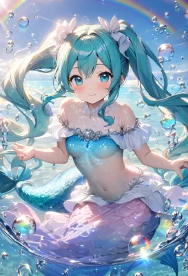 masterpiece, best quality, extremely detailed, anime, girl, Hatsune Miku, VOCALOID, turquoise blue long twintails, clear beautiful blue eyes, girl, mermaid, playing harp on rocky shore at night with full moon and starry sky, mermaid, beautiful girl, cute, gentle smile, sparkling soap bubbles, pale blue sea firefly lights, fantastical, mysterious, fantasy