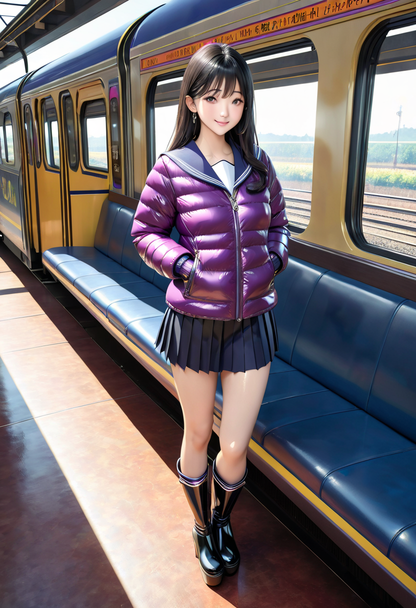 (photorealistic:1.4), (RAW photo), masterpiece, best quality, extremely detailed, lady, neat and clean, elegant, polite, shy, black long hair, almond eyes, smile, slim fit, closed zipper, (shiny purple short puffer down jacket), ((sailor collar)), pleated skirt, (platform long rubber boots), (holding miniature super express train model)