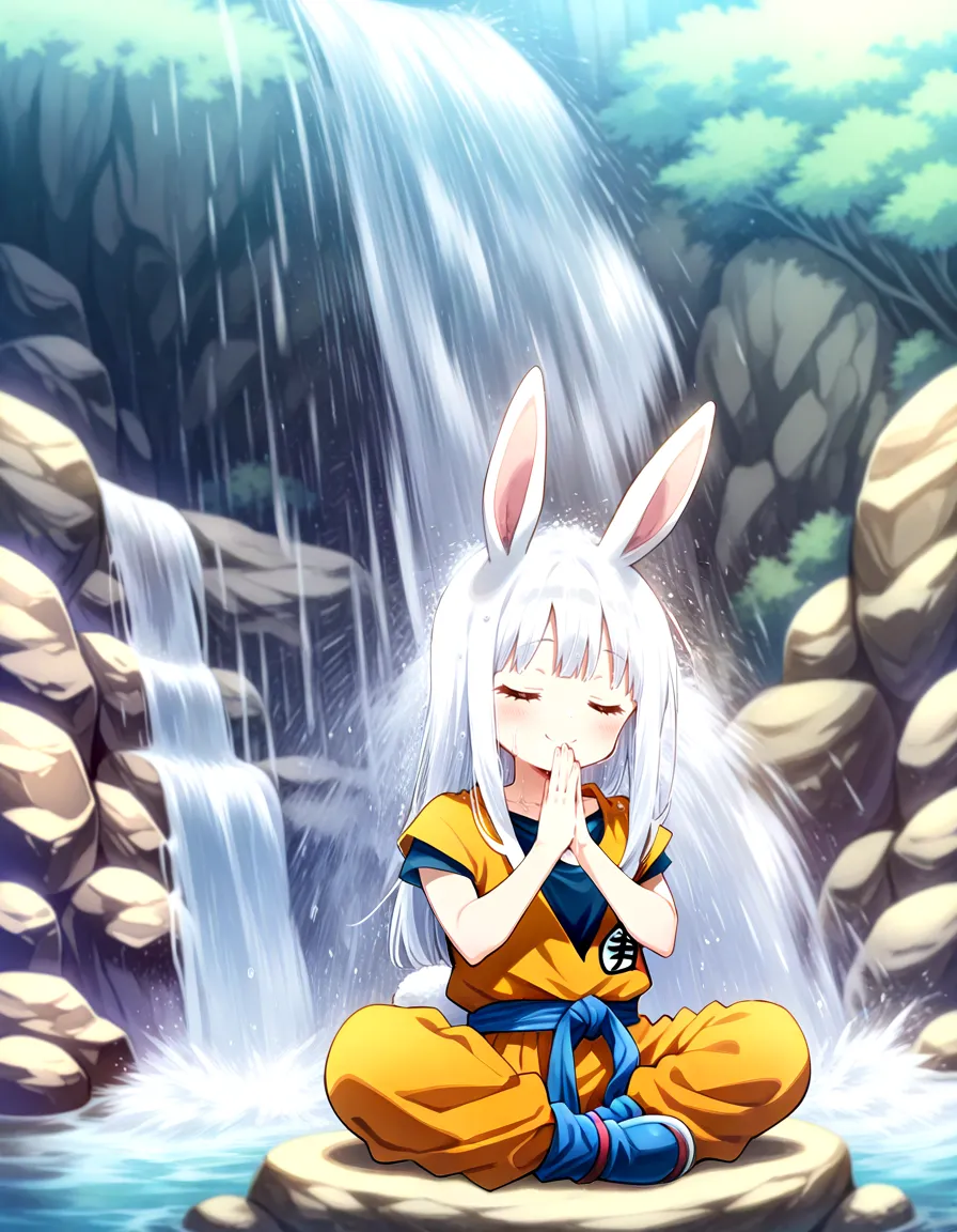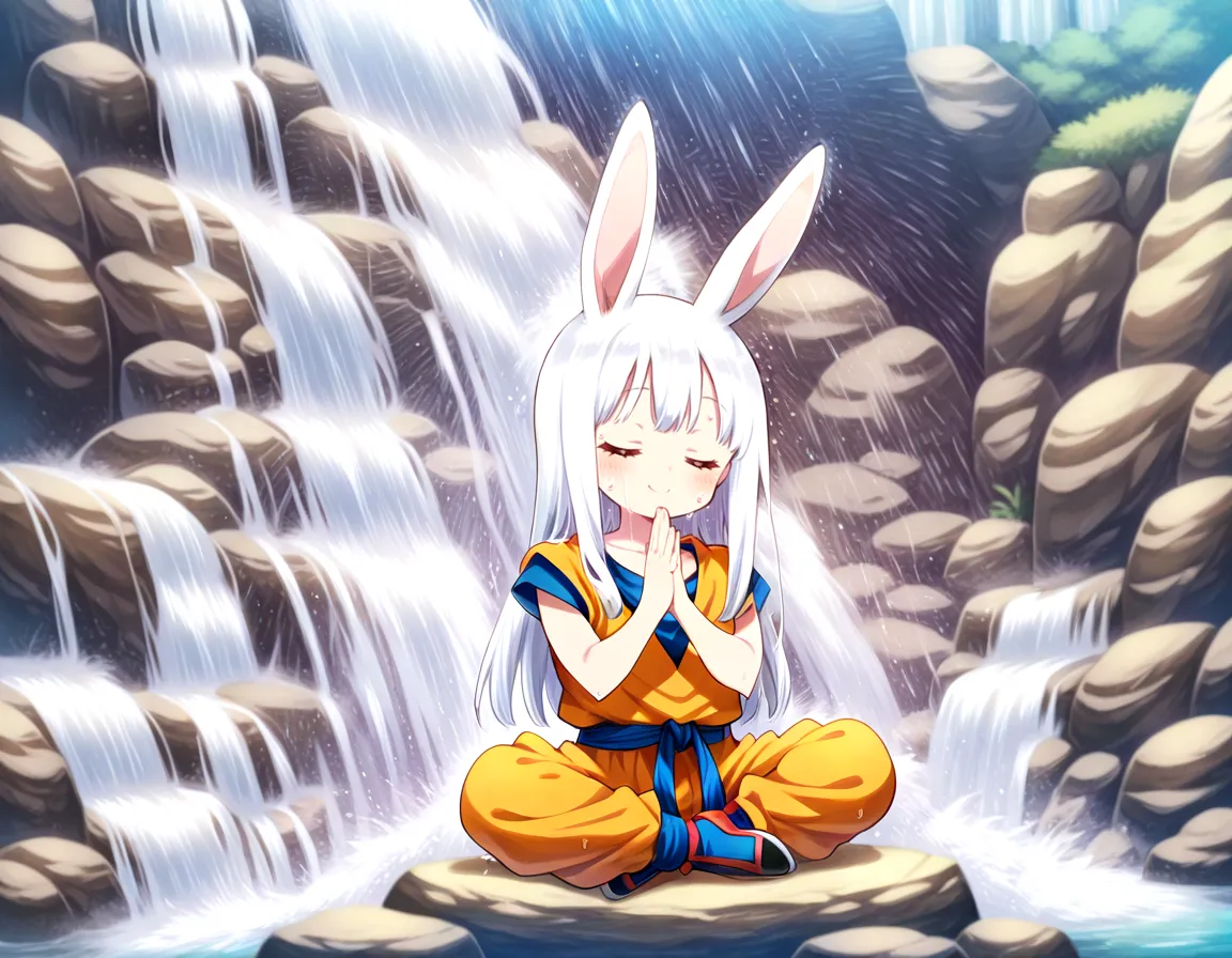 <1~2枚目:滝行を水遊びと豪語する白兎ちゃん> ハーッハッハッハッ! わたし様の水遊びはそこらのなまっちょろいもんではないのだぁぁぁ!!! サイキョーなアルティメットでゴッドなラビットになるべくしゅぎょーを兼ねた水遊び滝行をやるぜぇい! <3~4枚目:修行を経て伝説のスーパーサイヤラビットになった白兎ちゃん> フハハハ!!! しゅぎょーのせーかを見せてやるぜぇい! ウオォォォォォ!!! ハーッハッハッハッ! これがスーパーサイヤラビットだぁぁぁ!!! <5~8枚目:かめはめ波を放つ白兎ちゃん!> さあ、この勢いでかめはめ波を撃つのだぁぁぁ!!! か~め~は~め~派ぁぁぁーーー!!! <END> 最近ウサァべえばかりやってて、感覚的に久しぶりな気がする厨二な白兎ちゃんです♪ 滝行だけで完結のつもりが、スーパーサイヤ人ネタを挟んだらかめはめ波もやりたくなってしまって、当初の予定より手間をかけましたw LoRAを駆使しまくりで①滝行、②スーパーサイヤ人、③かめはめ波(チャージ)、④かめはめ波(撃つ)の4つのLoRAを2枚ずつ順に活用しております! かめはめ波はDanbooruタグもあったのでLoRA使わなくても再現性あるかもと思い、LoRAを外すと手のポージングが不安定になったのでLoRAは必要な感じでした(;・∀・) 白兎ちゃんは髪が長いから最初からスーパーサイヤ人スリーっぽくなるのがちょっとお得に思ったりしましたw バトル系の再現は楽しいから興が乗って色々遊べて楽しかったです♪
