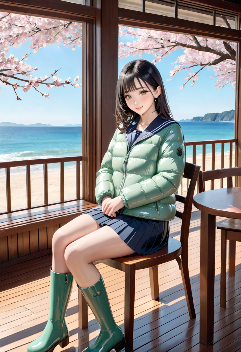 (photorealistic:1.4), (RAW photo), masterpiece, best quality, extremely detailed, lady, neat and clean, elegant, polite, (shy:0.9), black long hair, almond eyes, (smile:0.9), slim fit, closed zipper, (shiny pale mint green short puffer down jacket), (navy sailor collar:1.3), pleated skirt, platform long rubber boots, fashionable wooden cafe, sit on chair, cherry blossom branch in vase, ocean view, cold sunny day