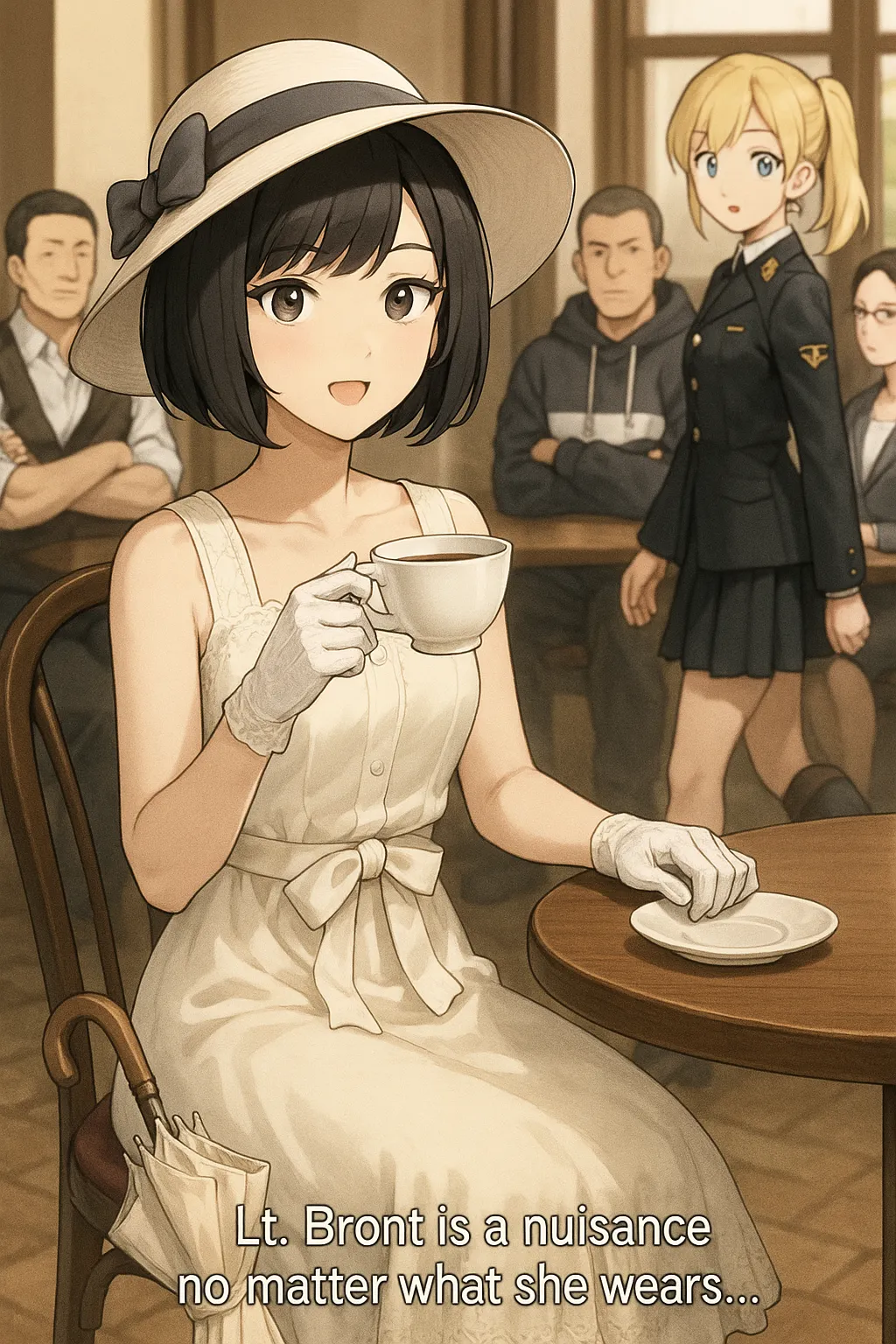 春の陽気が街に満ち、オープンカフェのテラス席には柔らかな日差しと微風が流れていた。 花が咲き誇る街路樹の下、ブロント少尉は一人、白い陶器のティーカップを手に優雅に紅茶を啜っていた。 ブロント少尉はいつものように黒の詰襟軍服にミニプリーツスカート姿なのだが、なぜか、 店の落ち着いたカフェ調の雰囲気にも馴染んでいた 金髪のポニーテールが風に揺れるその姿は、春のポストカードそのものだったが―― 周囲の席には、どこか場違いな服装の男女が散らばっていた。 一見すると一般市民風だが、誰も彼も、微妙に浮いている。 無駄に筋張った体型に、ゆるすぎるパーカー。 頑丈そうなブーツに、ありえない角度で日焼けした肌。 明らかに軍人たちが私服で偽装しているのだが、周囲には筋ものであることがバレバレだ。 だが、肝心のブロント少尉は気づく気配すらない。 「あの子、まったく油断してるのか、それとも……」 小声でつぶやく一人の男――元レンジャー部隊の教官が、苦々しく視線を向ける。 「いや……“いつもあれ”だからな……」 別の教官が曖昧な口調で返す。 彼らには、先日、教頭からこんな指示が下っていた。 「……ええ、つまり、彼女の民間交流行動における“適応力”を、観察して記録してください。 ええ、過度な接触は控え、あくまで“適応”です。 ……あ、報告内容は“その場にいた者の責任で”まとめてくださいね」 ――要するに、“うまいこと見張れ”。教頭らしい、玉虫色の命令だった。 しかし、肝心の対象者は、そんな教官たちの努力をよそに、至福の表情でスコーンにクロテッドクリームを乗せている。 「やっぱりアールグレイにはこれが最高ですな」と小さくうなずきながら。 そして、ブロント少尉は、立ち上がった。 (トイレか?) (移動?) (尾行するか?) 瞬時に教官たちの間に緊張が走る。 しかし、彼女はそのまま会計をすまし店を出ていく (帰ったのか) (とりあえず店には迷惑はかけなかったか) (俺らも移動するぞ) 誰もがほっと息をついたとき―― 「てへっ、忘れ物しちゃったっと♪」 軽快な声と共に、ブロント少尉が戻ってきた。 何食わぬ顔で席に戻りながら、テーブルに置き忘れていた“ミリタリー風マグカップ”を手に取ろうとして・・・・・・。 咄嗟に立ち上がって敬礼する監視教官たち。 完全に“職業病”だった。 ブロント少尉はきょとんとした顔で振り返る。 「えっ、皆さん居たんですか。休暇中でしたか? プライベートなら敬礼は不要ですよ。つかれちゃいますよ?」 ──(……誰のせいだと思ってんだ、誰の) 教官たちの心に一斉に浮かんだ言葉を、誰も声に出すことはなかった。 その様子を斜め向かいのテーブルから静かに見つめる一人の女性がいた。 淡いクリーム色のサマードレスに、つば広の麦わら帽子。 富士見軍曹だ。 カップを口元に運びながら、視線をブロント少尉に向け、口元をわずかに緩めた。 「どこにいても……どんな格好でも、あの人は傍迷惑ですね……」 その言葉の裏に、軽い呆れと共に好意、一抹の羨望が混じっているのを、本人は気づいていない。 実のところ、富士見軍曹も監視対象の一人であり、今日のこの場所も、偶然ではなかった。 最も富士見軍曹をまともに監視できる他の教官などいないのだが・・・・・・。 ――だが、彼女は今日、「紅茶を味わう側としての」矜持を胸に秘め、このサマードレス姿で臨んでいた。 紅茶道で一歩遅れを取った悔しさを、この優雅な振る舞いで取り返そうと。 そんな中、教官たちが明らかに“尾行”している様子に気づいた軍曹は、ふと思いついた。 「……どうせ教頭あたりがあいまいな命令出したんでしょ。だったら――あんたも監視されなさいよ」 富士見軍曹は、スマートフォンを手に取り、教頭(54歳独身、しれっと自分も休暇中)へ一通のメッセージを送った。 「教頭も観察されてくださいね。『緊急連絡……教頭だけがご存じの、“あの話”について、関係があるかもしれません……紅茶の似合う服で来てください』」 それが数十分前。 そして今ベストのタイミングで・・・・・・ 歩道の向こうから、颯爽と姿を現す一人の男。 ロマンスグレーの髪に、白のシャツとシンプルな紺のジャケット。 ストレートパンツに、光沢のあるローファー。 50代という年齢にも関わらず、その立ち姿はまるで映画俳優。 “教頭”が現れた。 「やれやれ、呼び出されるとはな……この格好では気が引けるよ」 と苦笑しつつも、その顔はどこか誇らしげで、富士見軍曹の横に立つその姿には、“デート”の空気が濃厚に漂っていた。 富士見軍曹は立ち上がり、控えめに頭を下げる。 並び立つその二人の姿は、まさに絵画のようだった。 ――しかし、その光景を見ていた教官たちの表情は引きつっていた。 「……あれは……教頭!?」 「なんで……ここに……」 「あいつ、なんでかっこつけてるんだよ……!」 教官たちの心がひとつになった。 (……なぜ、俺たちがこの