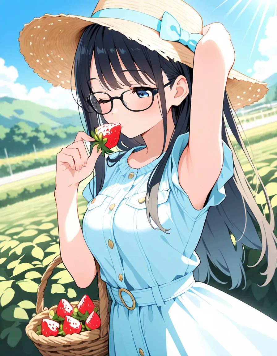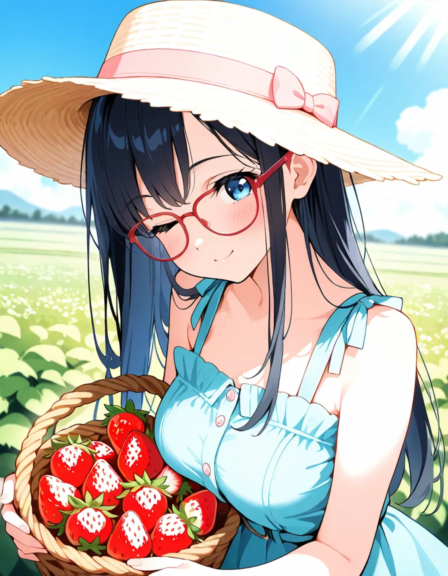 ((masterpiece)), ((best quality)), (ultra-detailed), ((kawaii)), cute, (lovely), animated style illustration, outdoor, (at a tourist strawberry farm in early summer:1.5), 1girl, cute girl, (Dutch angle shot:1.2), upper body, (beautiful blue eyes), (beautiful black hair), (long hair), slim, slender, medium breast, (glasses), (winking:1.2), (one eye closed), (Lively smiles:1.2), (kissing a strawberry she picked up:1.4), (holding a basket of strawberries:1.2), wearing a cute and practical outfit for easy movement, a stylish straw boater hat, cheerful expression, lush green field under clear blue sky, warm sunlight, (cute pose).