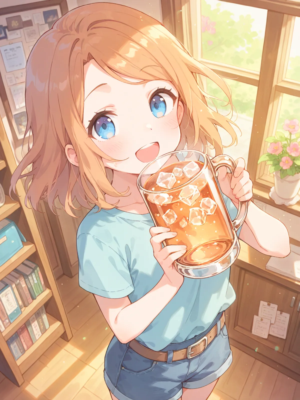暑い日に大きなジョッキで豪快に冷や麦茶を飲む女の子を作ってみました。