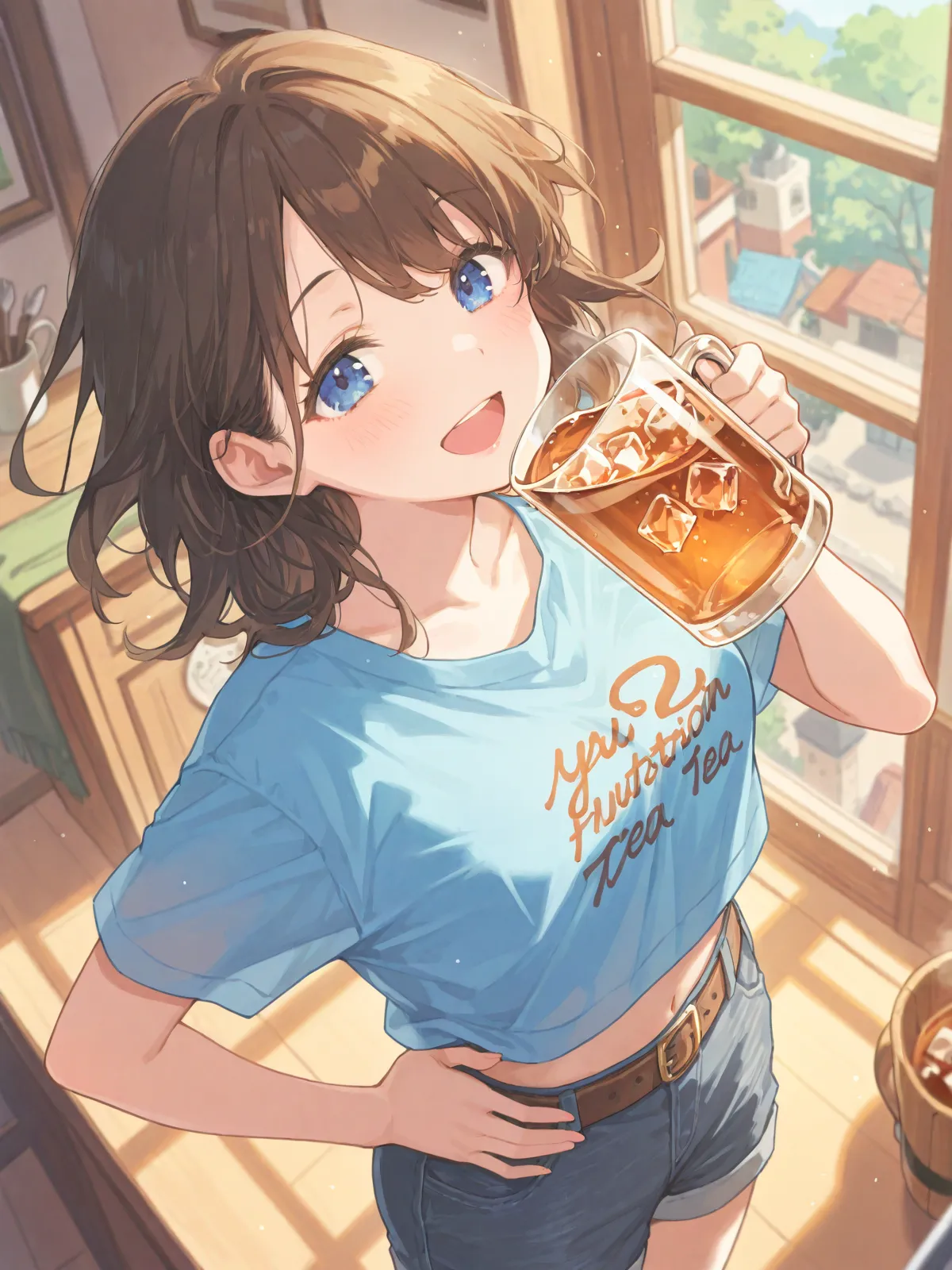 girl gulping barley tea, drinking vigorously, mug of iced tea, Transparent big mug with handle, summer, short sleeves, in room, put lips on mug, look up, dynamic angle, happy, standing, place hand on waist, ice cube in tea,