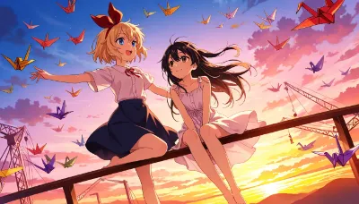 2girls,(anime style:1.2),children,(blonde hair:1.1),(short bob haircut:1.1),(blue eyes:1.1),(hair bow,red bow:1.4),black hair,long straight hair,innocent expressions,small chest,elementary school uniform,sailor dress,(holding transparent umbrella:1.2),walking together,countryside path,rural road,rice fields,mountains in background,cloudy sky,after rain atmosphere,puddles on dirt road,small steps,holding hands,one girl looking forward,other girl looking at friend,gentle smile,full body view,side view pose,small feet in white socks and brown school shoes,trees lining the path,(masterpiece:1.3),(best quality:1.3),(very aesthetic:1.2),(absurdres:1.2),