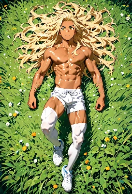 Blonde hair, long hair, silky hair.Gentle smile. Large, sparkling amber eyes. Legs are muscular, toned and very long. Shirtless. White sport-bra. Short white shorts. White loose socks. Wearing white sports shoes with red accents. masterpiece, best quality, extremely detailed, anime