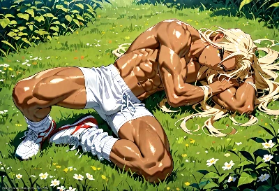 A girl of anime style, 14 years old, lying on grass field in the daytime on a sunny day. Brown skin with a slippery and shiny surface. Full body.