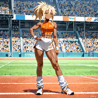 A girl of anime style, 16 years old, standing on a sports field in the daytime on a sunny day. Brown skin with a slippery and shiny surface. Blonde hair in a ponytail. Large, sparkling amber eyes. Legs are muscular, toned and very long.Tight, short white shorts. White loose socks. Wearing white sports shoes with red accents.Dynamic pose