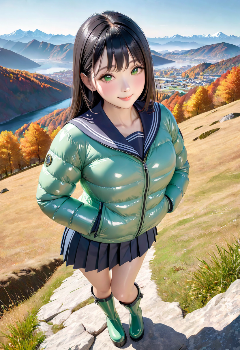 (photorealistic:1.4), (RAW photo), masterpiece, best quality, extremely detailed, lady, neat and clean, elegant, polite, (shy:0.9), black long hair, almond eyes, (smile:0.9), slim fit, closed zipper, (shiny pale mint green short puffer down jacket), (navy sailor collar:1.3), pleated skirt, platform long rubber boots, standing pose, (high angle shot:0.7), on the hill, good view, mountains, cold autumn sky