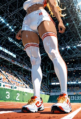 A girl of anime style, 16 years old, standing on a sports field in the daytime on a sunny day. Brown skin with a slippery and shiny surface. Blonde hair in a ponytail. Large, sparkling amber eyes. Legs are muscular, toned and very long.Tight, short white shorts. White thigh stockings. Wearing white sports shoes with red accents.Low angle.
