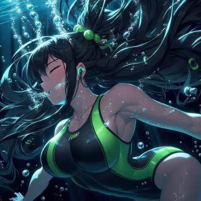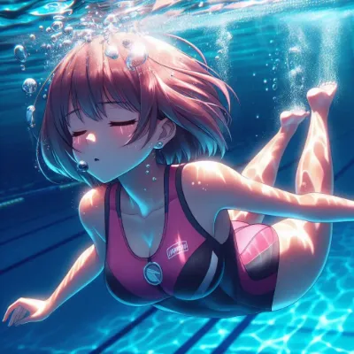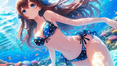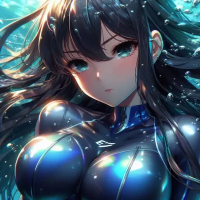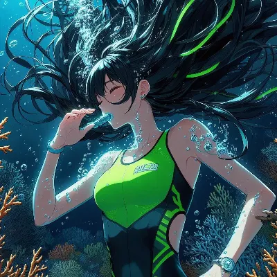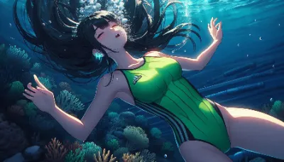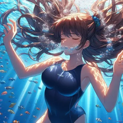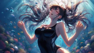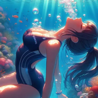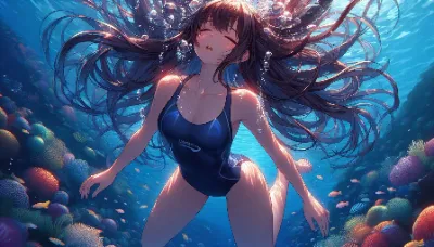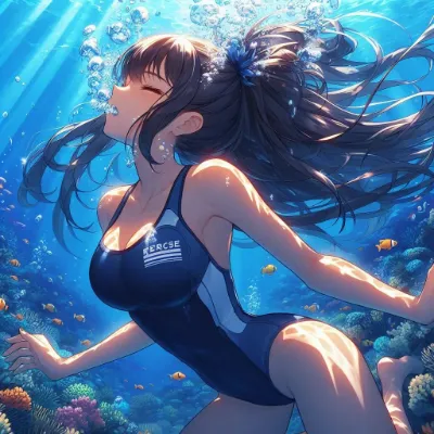 Japanese Moe-style image of a girl of Asian descent unable to hold her breath swimming at the bottom of the Coral Sea. She is wearing a sleek competitive metallic indigo swimsuit and has long, flowing black hair. She appears to be exhaling or struggling underwater, with many bubbles escaping from her mouth. The underwater scene is filled with vibrant light patterns from the sun, colorful fish, and aquatic plants. She closes light eye.Best Quality.