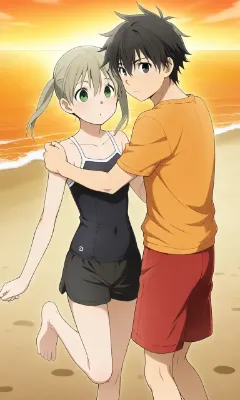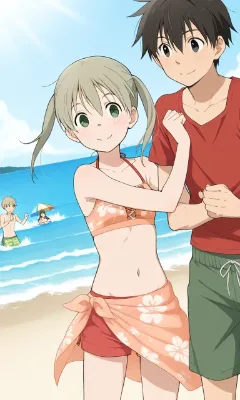 Boy, girl, couple,A joyful couple dances barefoot on a midsummer beach as the sun sets, casting an orange hue over the scene. The woman wears a sporty two-piece swimsuit with neon yellow accents, her laughter echoing as she twirls. The man, in simple navy swim trunks, spins her gently, their footprints marking the soft sand. A bonfire glows faintly in the background.