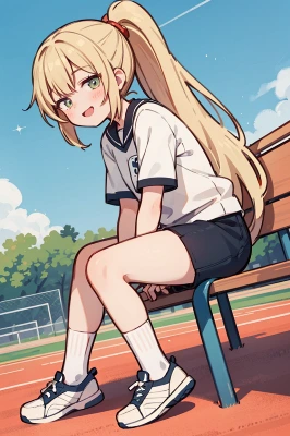 A girl of anime style, 16 years old, sit on a bench on a sports field in the daytime on a sunny day. Brown skin with a slippery and shiny surface. Blonde hair in a ponytail. Large, sparkling amber eyes. Legs are muscular, toned and very long.Tight, short white shorts. White loose socks. Wearing white sports shoes with red accents. full body,smile.low angle.