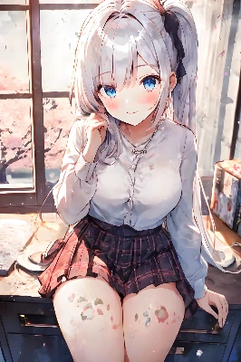 ((School uniform, White collared shirt, Plain pattern shirt, Long sleeves, Shirt tucked in:1, Red plain pattern narrow neck ribbon:1.1,Black and grey plaid pattern skirt:1, Pleated skirt, miniskirt:1.2, White plain pattern socks:1.2, Loafers)),