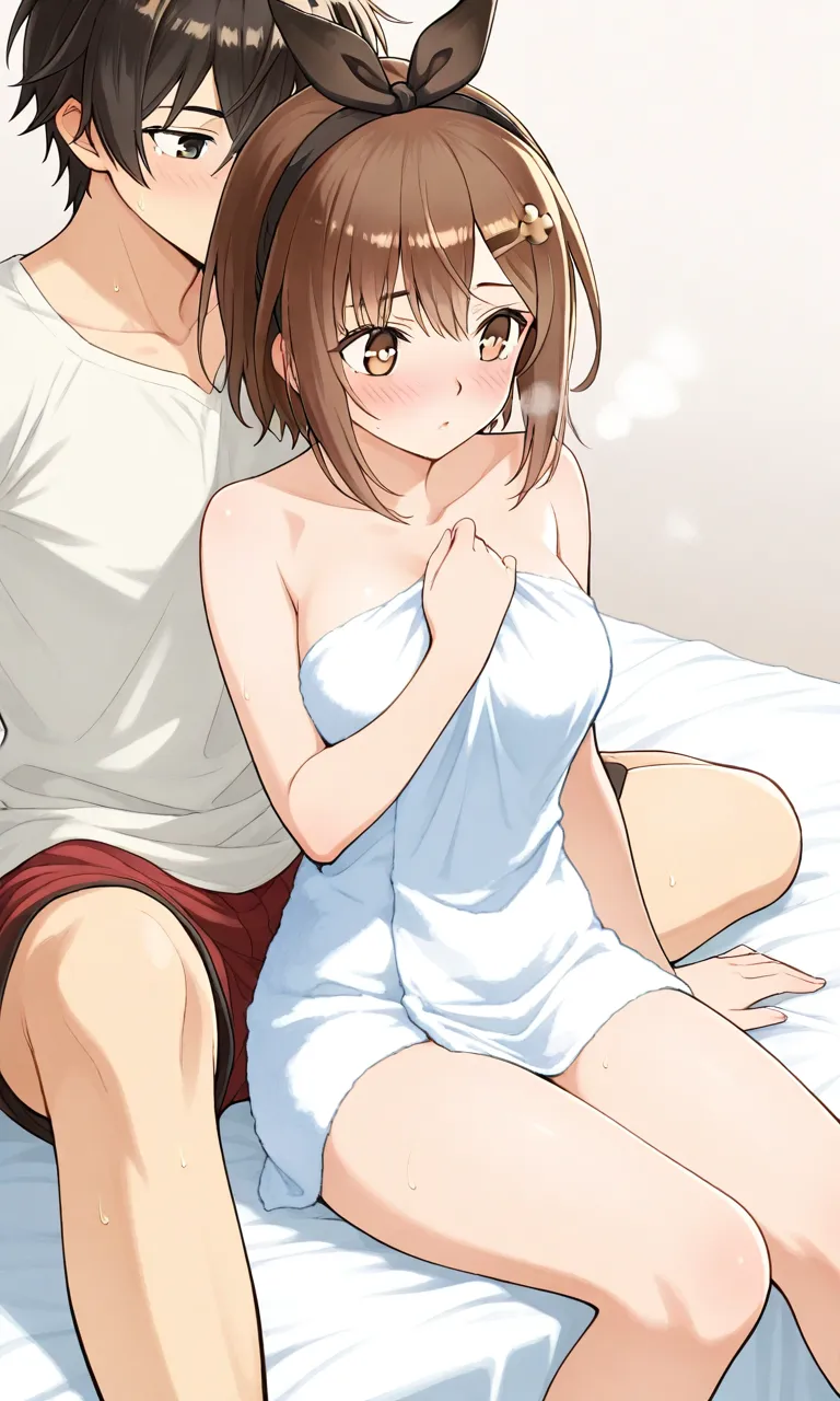 Boy, girl, couple,a man and woman sitting together on the bed ,1girl, 1boy, sitting, blush, hetero, towel, naked towel, after sex