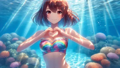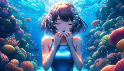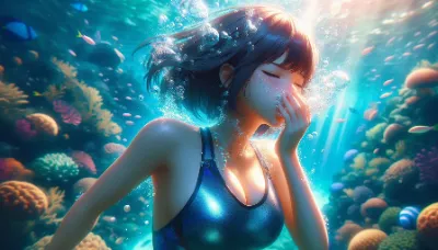 Japanese Moe style image of a girl of Asian descent unable to hold her breath while swimming at the bottom of the Coral Sea. She is wearing a sleek competitive sleeveless metallic blue swimsuit and has flowing short hair. She appears to be exhaling or struggling underwater, with many bubbles escaping from her mouth. The underwater scene is filled with vibrant light patterns from the sun, colorful fish, and aquatic plants. She closes eyes.Her hands puts her mouth.