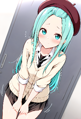 solo, 1girl, gyaru, long straight hair, aqua hair, forehead, school uniform,