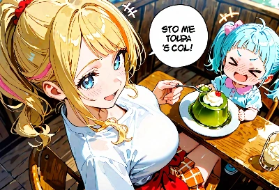 (best quarity:1.5, ultra high resolution, 8K, masterpiece), (shiny skin, extremely detailed, perfect anatomy, very aesthetic), (comic, speech bubble, frame, focus line, comic expression, sound effect), (chibi:1.3), (1+ girl), large breasts, large eyes:1.2, plump, (orange hair, bare forehead, show off forehead, short puffy ponytail), (black bandeau bikini, bandeau bikini under T-shirt:1.2, grey T-shirt, see-through T-shirt, grey bloomers, black pantyhose, sneakers), (playing soccer, leg kicked soccer ball, motion line, aura around soccer ball, swooping soccer ball from sky above), (v shaped eyebrows, blush, soccer ground, outdoor), dutch angle, (super fine illustration, photorealistic, depth of field:0.4), <lora:hairdetailer:0.8>