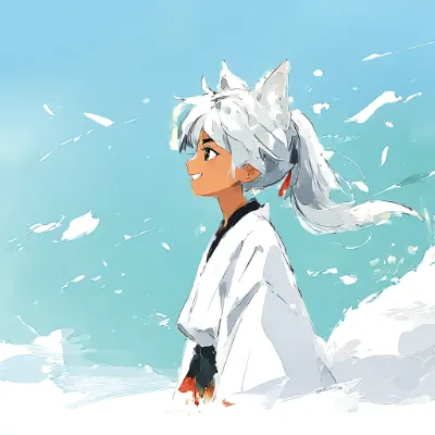 japanese anime, flat color, sunny day, transparent atmosphere, dynamical scene, beautiful japanese queen, beautiful dark-skinned girl, wild girl, white japanese miko clothes, silk clothes, black neck undershirt, white hair, fox ears, thick eyebrows, happy, looking other side, --sref 3041926644 --v 7 --profile nqxtb7h