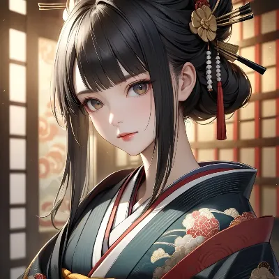 古い屋敷の片隅で、彼女は静かに座っていた。色鮮やかな着物が夕暮れの灯りに映え、青い瞳に宿るのは遠い記憶か、それともこれから訪れる運命か。祭りの夜、偶然出会った旅人と交わした約束が、彼女の心を揺さぶる。風が障子を叩く中、物語は静かに動き出す。どんな結末が待っているのだろうか。