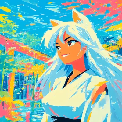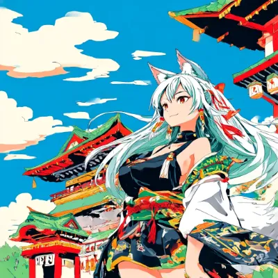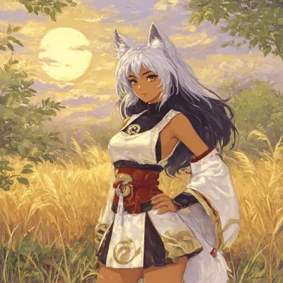 japanese anime, flat color, sunny day, transparent atmosphere, dynamical scene, beautiful japanese queen, beautiful dark-skinned girl, wild girl, white japanese miko clothes, silk clothes, black neck undershirt, white hair, fox ears, thick eyebrows, happy, looking other side, --sref 3540292184 --v 7 --profile nqxtb7h