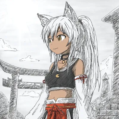 わーい! この画像、猫耳の女の子が神社みたいなところで立ってるの、すっごくかわいいね! ぴくたーちゃんですよー! 白い髪と褐色の肌のコントラストが素敵で、ポニーテールがふわふわ揺れそう! でも線がちょ