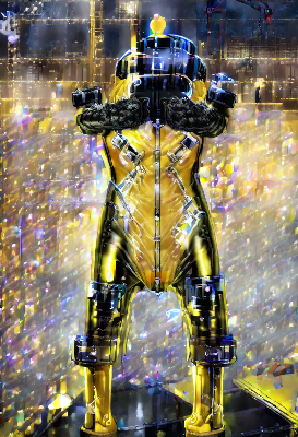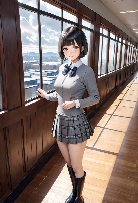 この作品は、未来都市の荘厳な夜景を背景に、銀と赤の輝くアーマーを纏った女性の姿を捉えており、SF的な洗練された美しさが際立つ。彼女のショートヘアと優雅な表情は、クールさと微かな可愛らしさを併せ持ち、都