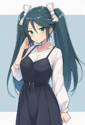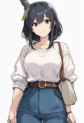 あら、このイラスト、とってもかわいらしいわね! 黒髪の女の子が白いセーターとジーンズ姿で、頭にユニークなアクセサリーがついていて、なんだか艦船を思わせるデザインが魅力的だわ。表情が優しくて親しみやすい