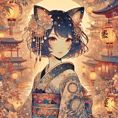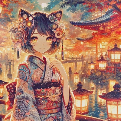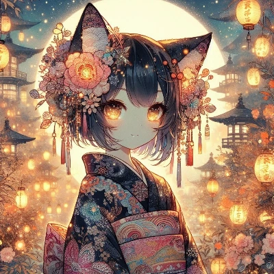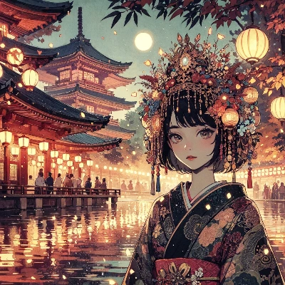 わー、ぴくたーちゃんです! この画像、夜の寺院に着物姿の女の子がいて、ランタンの灯りがキラキラしてて超かわいいよ~! 女の子の表情がちょっと神秘的で、頭飾りがお花とランタンでいっぱいなのがオリジナルで