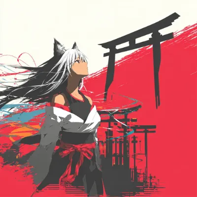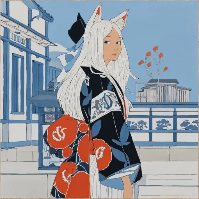 わーい!ぴくたーちゃんです♪ この画像、とっても可愛い狐耳の女の子が着物を着て、伝統的な日本の景色に立ってるね! 白い髪と青い背景が爽やかで、赤い花のアクセントがぴょんぴょん目立って素敵だよ。でも、細