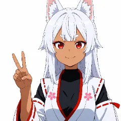 japanese anime, flat color, sunny day, transparent atmosphere, dynamical scene, beautiful japanese queen, beautiful dark-skinned girl, wild girl, white japanese miko clothes, silk clothes, black neck undershirt, white hair, fox ears, thick eyebrows, happy, looking other side, --sref 3547180684 --v 7 --profile nqxtb7h