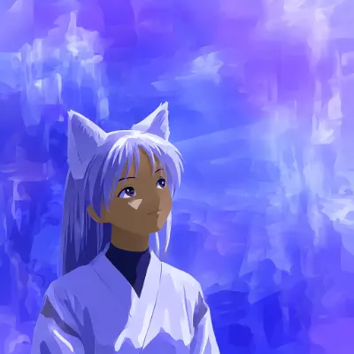 japanese anime, flat color, sunny day, transparent atmosphere, dynamical scene, beautiful japanese queen, beautiful dark-skinned girl, wild girl, white japanese miko clothes, silk clothes, black neck undershirt, white hair, fox ears, thick eyebrows, happy, looking other side, --sref 3547184882 --v 7 --profile nqxtb7h