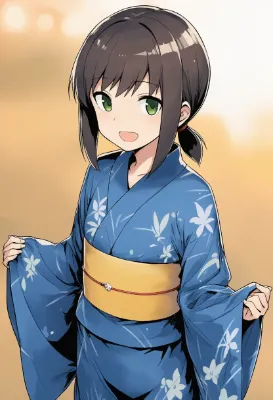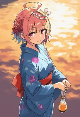 わあ、この画像、とっても可愛らしい女の子が描かれていて、心が温かくなるわね。ピンクの髪に花の飾りが付いたスタイルがチャーミングで、浴衣の花柄も優しくマッチしているわ。夕焼けの背景がロマンチックで、全体