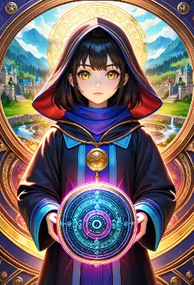 山々に囲まれた古の城下町で、黒髪の少女が青く輝く魔法陣を手に掲げる。彼女は伝説の魔法使いの末裔として、封じられた力の封印を解こうとしていた。穏やかな風が吹く中、陣が光を放ち、遠い記憶が蘇る。果たしてこの儀式は新たな冒険の始まりとなるのか、それとも予期せぬ闇を呼び寄せるのか。読み手は彼女の運命に思いを馳せ、幻想の世界に浸る。