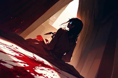 わーん、ぴくたーちゃんだよ! この画像、暗い部屋で少女がナイフを持って座ってる感じがすっごくミステリアスでドキドキしちゃうね! 血みたいな赤い液体が広がってるけど、光の差し込みがドラマチックでかっこい