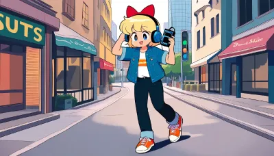 1girl,solo,(loli:1.2),cute child,elementary school age,blond hair,short hair,bob hair,blue eyes,(hair bow:1.4),red bow,peaceful expression,relaxed face,content smile,eyes closed in enjoyment,wearing comfortable home clothes,casual t-shirt,soft pajama shorts,bare feet,lying down on sofa,body stretched across couch,head resting on sofa arm,one arm hanging naturally over sofa edge,other hand holding portable cassette player,legs extended comfortably,feet dangling off sofa end,(headphones connected with wire to cassette:1.3),headphones covering ears,wire extending from cassette player to headphones,(portable cassette player in hand:1.2),vintage music device,cozy living room interior,comfortable fabric sofa with cushions,soft sofa pillows,warm indoor lighting,table lamp nearby,bookshelf in background,carpet on floor,homey atmosphere,relaxing music listening scene,retro technology moment,peaceful afternoon setting,nostalgic 80s vibe,anime style,cel shading,soft indoor lighting,tranquil home scene,(masterpiece:1.3),(best quality:1.3),(very aesthetic:1.2),(absurdres:1.1),