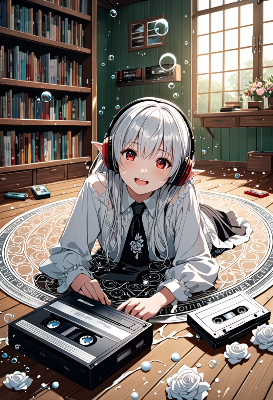 8K resolution,((cinematiclight,masterpiece,best quality,Ultra extremely detail everyone ,perfect anatomy,high-resolution,highres,extremely detailed,sharp focus)),((high-contrast:1.6,strong down-light, flower print)) ,((from_below:1.5,extreme zoom_up mouth,cute child elf wearing Blouse with black flower tie:1.5, outfit with sheer fabric, embroidered with white vine-like lace, with sleeves and brilliant sequins,wearing a traditional hachigane of rose,white unserwear, with big white brooch)),((best detailed red Eyes with eyeshadow:1.5 and reflection)), (messy platinum white hair),elf ear with big red earrings ,wetting face,tilt,cheek,blush,enough lip with lipstick and wet,Skin Gloss and skin is soaking wet, wet-lip:1.5,big hip,small breasts,Skin Gloss at legs,smile,looking at viewer,mouth wide open,hand cassette-tape o on a magic circle, Library,BREAK, magic circle,(((retro cassette tape on floor)),Bubbles,BREAK,blooming white rose farm, <lora:hohoaka:1> <lora:make25d_type1_v100:1>