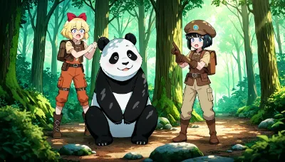 2girls,adolescent girls,(first girl blond hair:1.3),short hair,bob hair,blue eyes,(hair bow:1.4),red bow,amazed expression,wide open eyes,excited surprised face,second girl black hair,short hair,astonished expression,jaw dropped in wonder,both wearing adventurer outfits,leather vests,utility belts with pouches,sturdy boots,adventure gloves,backpacks,explorer hats,khaki colored pants,adventure gear accessories,standing side by side,pointing excitedly at panda,arms extended toward discovery,legs positioned in surprised stance,feet planted firmly on forest ground,(giant panda in forest clearing:1.3),black and white panda sitting peacefully,fluffy panda fur,round panda ears,cute panda face,dense forest setting,tall trees surrounding clearing,dappled sunlight through canopy,moss covered rocks,forest undergrowth,ferns and bushes,natural woodland atmosphere,adventure discovery moment,wildlife encounter scene,sense of wonder and excitement,anime style,cel shading,natural forest lighting,magical discovery scene,(masterpiece:1.3),(best quality:1.3),(very aesthetic:1.2),(absurdres:1.1),