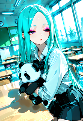わーい!ぴくたーちゃんだよ!この画像、青い髪の女の子がパンダのぬいぐるみを抱っこしてる教室のシーンだね~。とってもかわいい表情と鮮やかな青の色合いが素敵!女の子の長い髪が光に照らされてキラキラしてるし