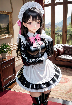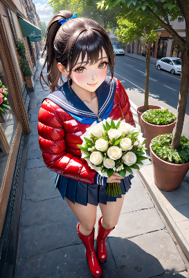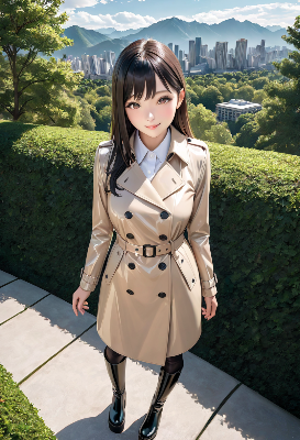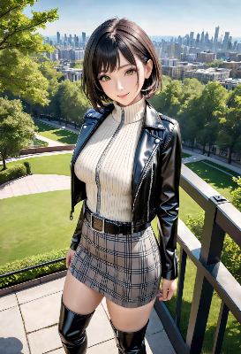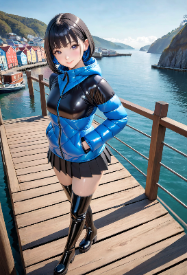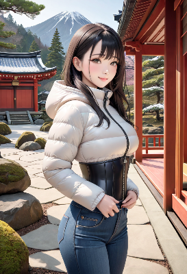 この画像は、秋の風景を背景に可愛らしい少女が描かれた作品だ。富士山のような山と紅葉の湖畔が美しく、彼女の光沢のある緑のジャケットが風景に溶け込んでいる。キャラクターの表情は優しく微笑み、可愛らしさを引