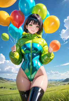 (photorealistic:1.4), (RAW photo), masterpiece, best quality, extremely detailed, lady, neat and clean, elegant, polite, (shy:0.9), black long hair, almond eyes, (smile:0.9), slim fit, high necked, closed zipper, (shiny bluish mint green long puffer down coat), black patent leather knee high boots, standing pose, (high angle shot:0.6), Japanese rural countryside scenery, good view, wildflowers, thatched roof house, deserted village, white birch forest, autumn hill, cold sunny day