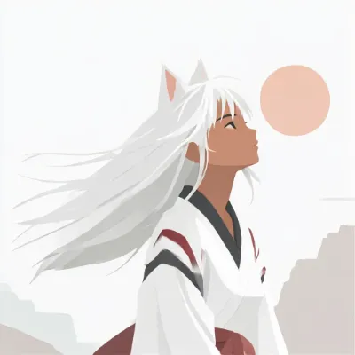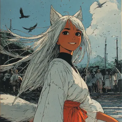 japanese anime, flat color, sunny day, transparent atmosphere, dynamical scene, beautiful japanese queen, beautiful dark-skinned girl, wild girl, white japanese miko clothes, silk clothes, black neck undershirt, white hair, fox ears, thick eyebrows, happy, looking other side, --sref 309421339 --v 7 --profile nqxtb7h