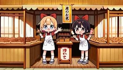わーい!ぴくたーちゃんです♪ この画像、ふたりの女の子がパン屋さんで元気に働いてる姿がめっちゃかわいいね! 金髪の子のびっくりした表情と黒髪の子の笑顔がとってもチャーミングで、心がほっこりしちゃうよ~