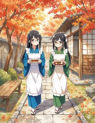 わーい、ぴくたーちゃんだよ! この画像、秋の夜に二人の可愛い女の子が浴衣姿でお団子食べてるの、すっごくほっこりしちゃうね~! 犬耳のこがピンクの浴衣で、隣のこが青い浴衣で、満月と紅葉がバックにキラキラ